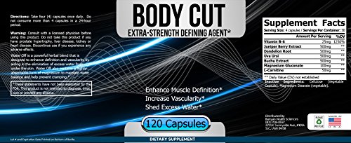 -. Binding : Health and Beauty -. Brand : Body Cut -. EAN : 0793456223436 -. Feature : MOST POPULAR WATER SHED SUPPLEMENT - More people seeking to decrease water retention and painful bloating without the potential side effects of prescription drugs are turning to Body Cut- our all natural homeopathic formula. Here's why: / FASTER RESULTS reported from customers. In many cases, positive effects are observed within days. / LONG-TERM AID with our all natural formula of vitamins and herbs that has been specifically designed to enhance vascularity to help lose those inconsistent water pounds while simultaneously being gentle on the system and controlling the amount of water weight maintained. / EXTRA-STRENGTH DEFINING - Body Cut acts as an extra-strength defining agent that enhances muscle definition, aids in weight loss and gives relief from bloating pain. / HIGHEST QUALITY - Body Cut uses the highest grade of natural ingredients. All our supplements are manufactured in a USA GMP certified facility. -. IsAdultProduct : 0 -. Label : Banyan Health Sciences -. Manufacturer : Banyan Health Sciences -. MPN : Body Cut -. PackageQuantity : 1 -. PartNumber : Body Cut -. ProductGroup : Health and Beauty -. ProductTypeName : HEALTH_PERSONAL_CARE -. Publisher : Banyan Health Sciences -. Studio : Banyan Health Sciences -. Title : Body Cut - Extra Strength Defining Agent - Shed Excess Water, Enhance Muscle Definition, and Increase Vascularity -. UPC : 793456223436