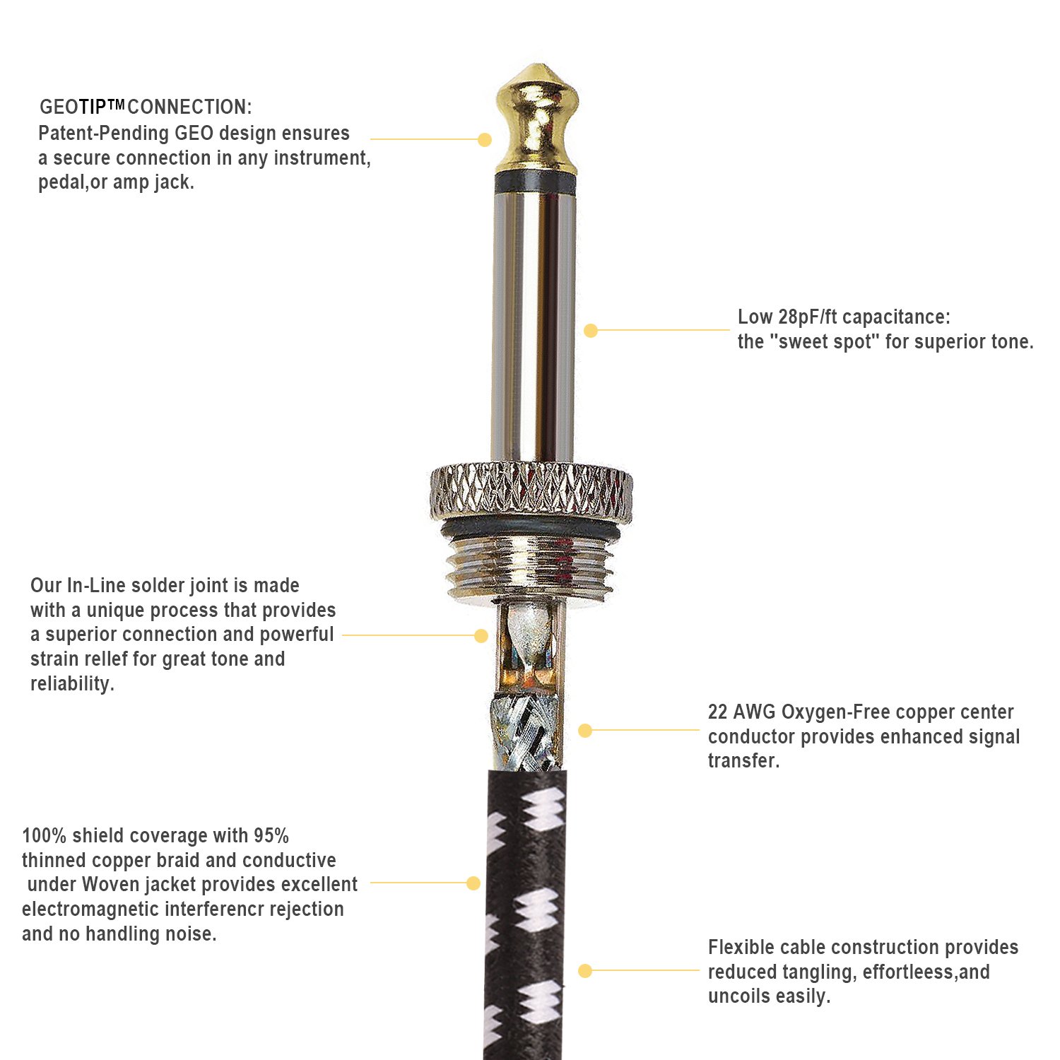 The Donner cable uses the finest OFC copper conductor to achieve a clear, natural mid range.