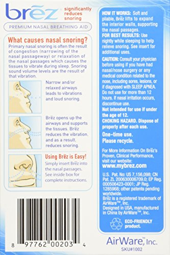 Studio : Brez Publisher : Brez Binding : Health and Beauty Product Description Brez premium Intranasal snore stopping breathing aid Fits Comfortably Inside Nasal Passages. Drug Free, Latex Free and Adhesive Free. Soft and Pliable. Significantly reduce snoring. 0