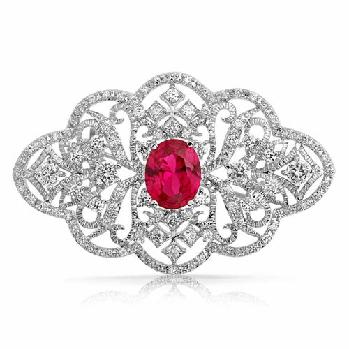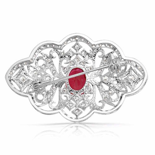 -. Feature : Simulated Red Ruby Victorian Style Brooch / Stone: 10 mm / Material: Rhodium Plated Brass, Cubic Zirconia / Measure: 1.8 inch L x 1.2 inch W / Weight: 9.7 grams