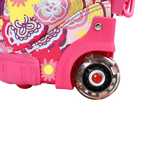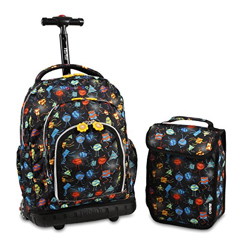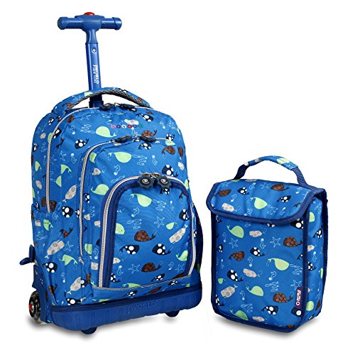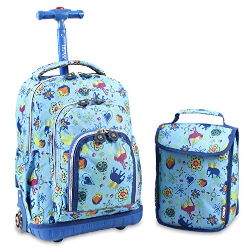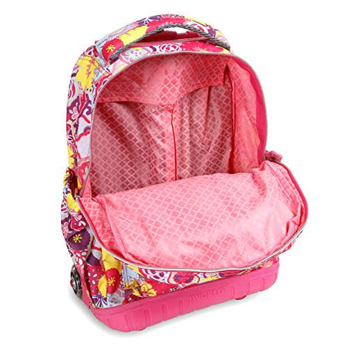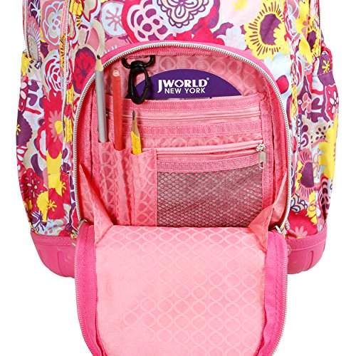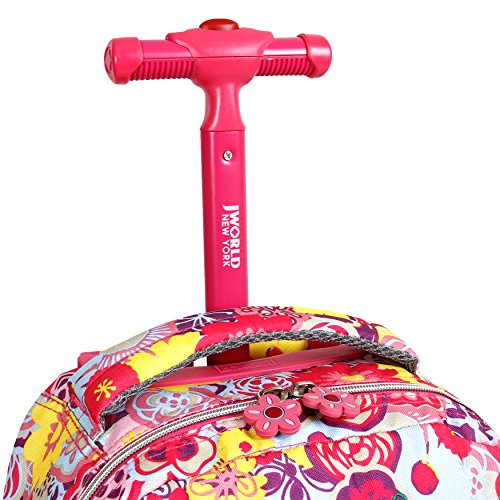 J world new york lollipop rolling backpack is great for elementary-aged children. There are multiple compartments to carry notebooks and school supplies as well as a front pocket with pencil holders, a key fob and a mesh pocket. The locking handle can be adjusted accordingly to put less strain while rolling the backpack. The padded straps and back provide comfort and keeps a healthy posture for the children. Zip closures keep the contents secured and the bag is made of water-resistant polyester.Feature
