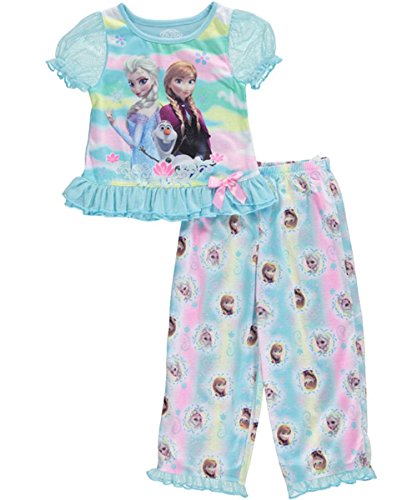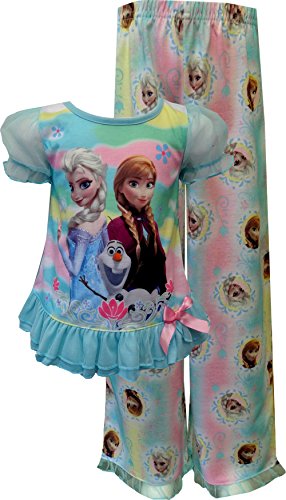 Disney brand the movie Frozen print pajamas for girls. The two piece pajamas have a short sleeved top and pajama pant bottoms. The top has Princess Elsa, Princess Anna and Olaf the Snowman printed on the front. The sleeves and leg cuffs are trimmed in ruffled mesh fabric. The top has a pretty ruffled bottom hem and pink bow applique. The polyester fabric is flame resistant.Feature