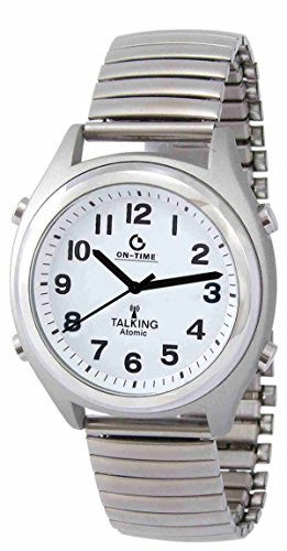 -. Feature : Always on time as it silently confirms the time nationally every morning at 3am / Lighter in weight than most talking watches / Clear male speaking voice, bold black hands and numbers on a white face / Provided with thorough instructions / 6 month warranty (batteries and watch band not included in warranty)
