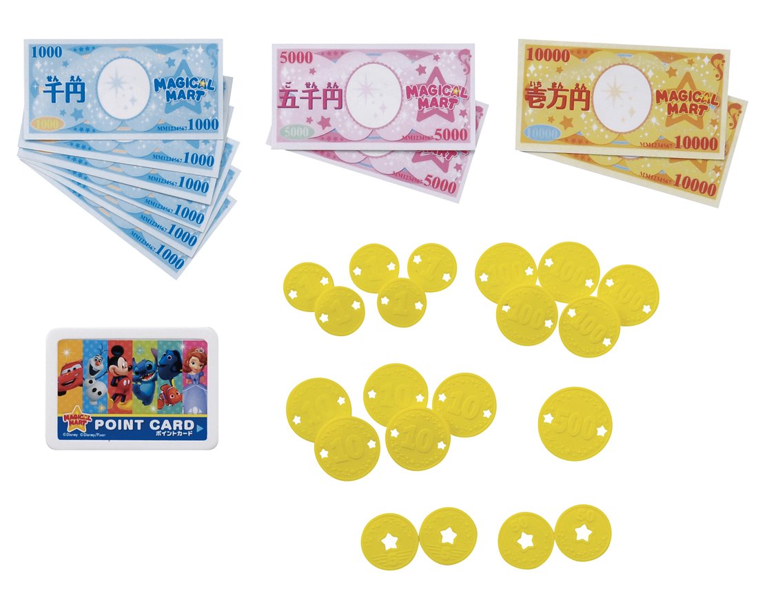 Grape (with RFID chip) (1), egg (containing RFID chip) (1), paper accessories (1), basket (1), coin (20), bill (10), point card (1), mini panfo