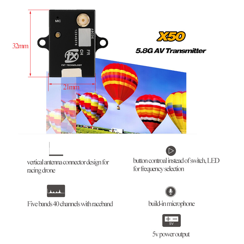 The X50-6 transmitter packs a whopping 600mW of ultra clean 5.8GHz power! A must for those who looking for longer range. The X50 is transmitting a full range of 40 channels and uses an easy way to change band by switch button.