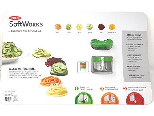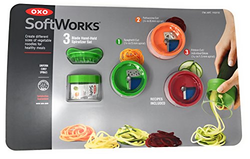 Studio : OXO International Publisher : OXO International Product Description Easy as one, two, three... Create three different sizes of vegetable noodles in a snap with OXO's 3 Blade Hand-Held Spiralizer. From zucchini "pasta" to beet salad to apple chips, these uniform spirals are fun, delicious and easy to make. 0