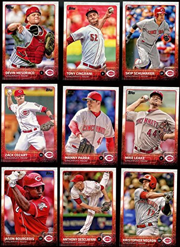 This is a Cincinnati Reds 2015 Topps Baseball Regular Issue complete mint 23 card team set; it was never issued in factory form. All Reds Cards from series #1 and #2 including Jay Bruce, Joey Votto, Johnny Cueto, Jason Bourgeois, Mike Leake, Anthony Desclafani, Raisel Iglesias, Brennan Boesch, Brayan Pena, Homer Bailey, Kristopher Negron, Yorman Rodriguez, Skip Schumaker, Manny Parra, Billy Hamilton, Zack Cozart, Aroldis Chapman, Brandon Phillips, Tony Cingrani, Daniel Corcino, Devin Mesoraco, Todd Frazier and a 2014 Reds Team Standings Card.