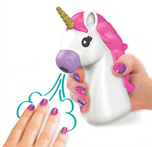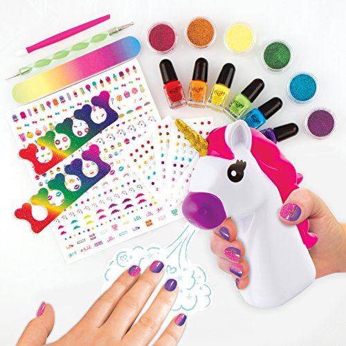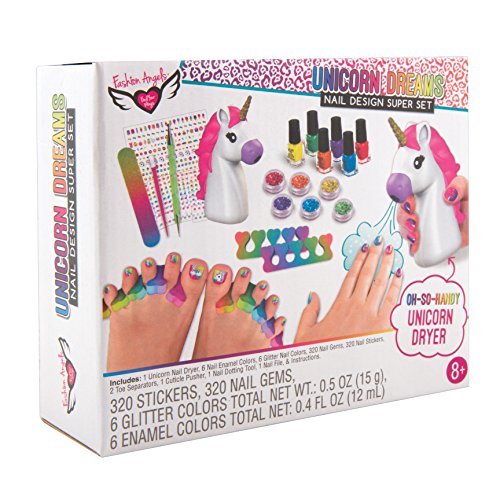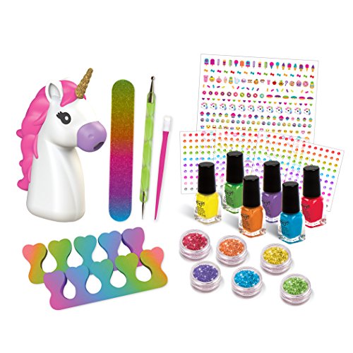 This unicorn-themed nail design super set has it all! Includes 6 glitter polishes, 6 enamel color polishes, 320 stickers, 320 nail gems, 6 pods of glitter (in 6 different colors), 2 toe separators, 1 cuticle pusher, 1 nail dot tool, 1 nail file and unicorn nail dryer. Colorful, step by step instruction booklet includes painting tips and inspirational designs. 2 x AA batteries required (not included). Ages 8+Feature