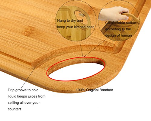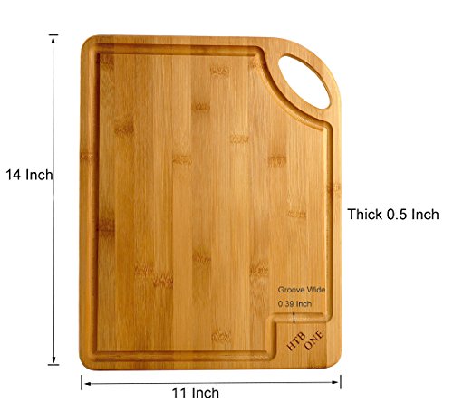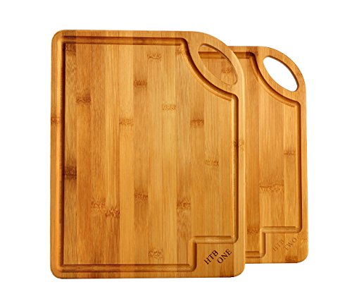 HTB 2PCS Totally Organic Bamboo Cutting Board Set With Handle Kitchen Chopping Board with Drip Groove for Food Prep, Meat, Vegetables, Fruits, Crackers & Cheese ,Serving 14 x 11 Inch