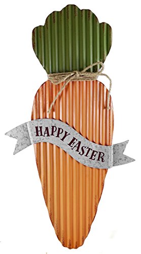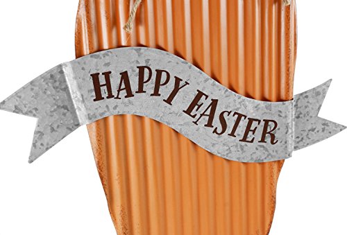 - Features a hand-painted corrugated tin carrot that says: "Happy Easter" with twine rope bow around the top
