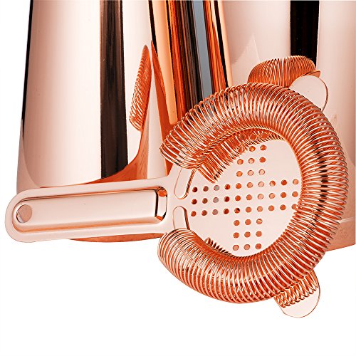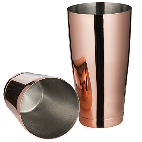 The strong body of this boston shaker ensures that the temperature of your cocktail is regulated. The thickness also prevents dents and the thick lips avoids cut when cleaning. Unlike regular shaker strainers, the strainer of this set is made of 100 springs versus the usual 30. Used and vetted by professionals, the 28oz tin and 18oz tin fit snugly into each other in a water-tight manner so that you don't spill your favorite cocktail while shaking. Additionally, the ergonomic design on this copper colored piece makes gripping real easy.