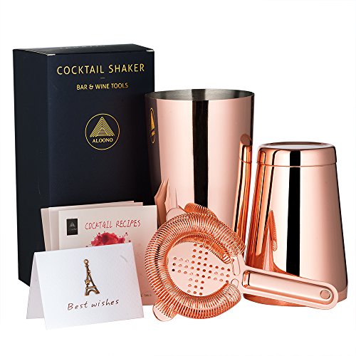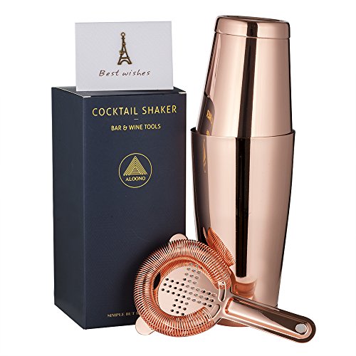 ALOONO brings to you the ultimate professional cocktail shaker. This premium quality 100% stainless steel, 3-piece set is made with 304 grade steel ensuring durability. Finished with a unique rose gold colored copper plate, this kitchen gadget is sure to stand out as a beautiful collectible for your bar counter.