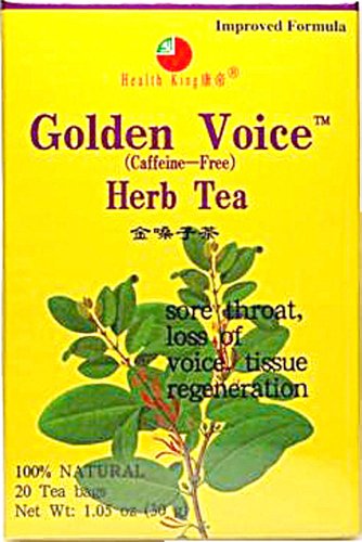 -. Binding : Health and Beauty -. Brand : Health King -. EAN : 0646322000559 -. Feature : Caffeine Free / Sore Throat, Loss of Voice, Tissue Regeneration / Based on a proven ancient formula Golden Voice Herb Tea is made of high quality herbs -. IsAdultProduct : 0 -. Label : Health King Medicinal Teas -. LegalDisclaimer : These statements have not been evaluated by the Food & Drug Administration. This products is not intended to diagnose, cure, mitigate, treat, or prevent any disease. -. Manufacturer : Health King Medicinal Teas -. Model : HK-42 -. MPN : 281840 -. NumberOfItems : 1 -. PackageQuantity : 1 -. PartNumber : 281840 -. ProductGroup : Health and Beauty -. ProductTypeName : HEALTH_PERSONAL_CARE -. PublicationDate : 2014-12-28 -. Publisher : Health King Medicinal Teas -. ReleaseDate : 2014-12-25 -. Size : 20 -. Studio : Health King Medicinal Teas -. Title : Health King Golden Voice Herb Tea, 20 Count -. UPC : 646322000559