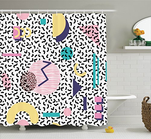 90s Shower Curtain by Ambesonne, Geometric Pattern in Retro Style with Round Half Moon Triangle Shapes Artwork, Fabric Bathroom Decor Set with Hooks, 70 Inches, Navy Yellow Pink