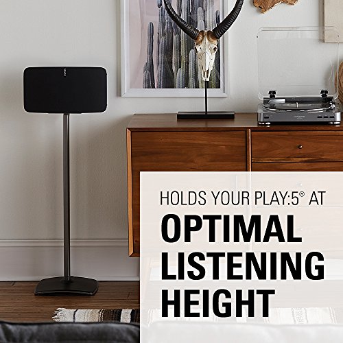 Studio : Sanus Publisher : Sanus Product Description Get your black SONOS PLAY:5 off the counter and onto a stand designed specifically for it. Here are a few reasons why a stand will make your life easier, and your black PLAY:5 more useful. 1. Flexible Positioning Using a stand with your awesome PLAY:5 speaker means you can put it anywhere in the room. Get the best sound quality no matter how you are using your speaker. With its unique design, the SONOS PLAY:5 can be set up horizontally or vertically. This stand supports both orientations so you can set it up whichever way is best for you. Plan on using your PLAY:5 on hardwood or carpet? No problem. We include carpet spikes and rubber pads to keep your stand stable on any surface. 2. Cable ManagementDon't worry about cables cramping your style. Hidden wire channels give the stand a seamless, cord-free look. Keeping the cables secure and out of the way reduces the chance of your dog accidentally knocking your speaker stand over. Built from high-end anodized aluminum, our stand is durable and looks great while hiding the cords. 3. Sound QualityMaximize the full sound your SONOS PLAY:5 produces by using a Sanus stand. We built it to be at the optimal height for accurate sound dispersion. How do we know the optimal height? SONOS told us. Not a bad source. If you just set your speaker on an end table you'll lose some sound quality. Using a stand with your PLAY:5 secures the speaker for optimum bass response. To get the best sound quality from your sweet PLAY:5, get a speaker stand. 4. The Sanus DifferenceWhen you get your SONOS accessories from us, not only do you get a high-quality product made specifically for SONOS but also access to our US-based customer service team. They're available 7 days a week to answer your questions or help with assembly. Although, you probably won't need it because our stand is made to be assembled in under 15 minutes with only a screwdriver. 0 |