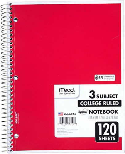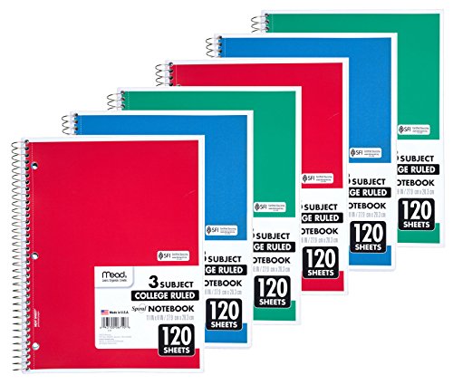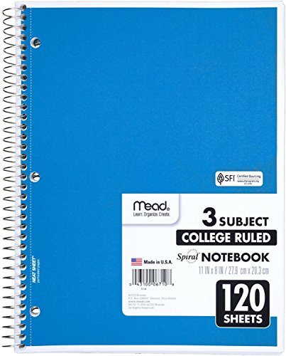 3 subject spiral notebook helps you organize class notes; white paper; 120 sheets, 11" x 8" page size; assorted colors - color you receive may vary