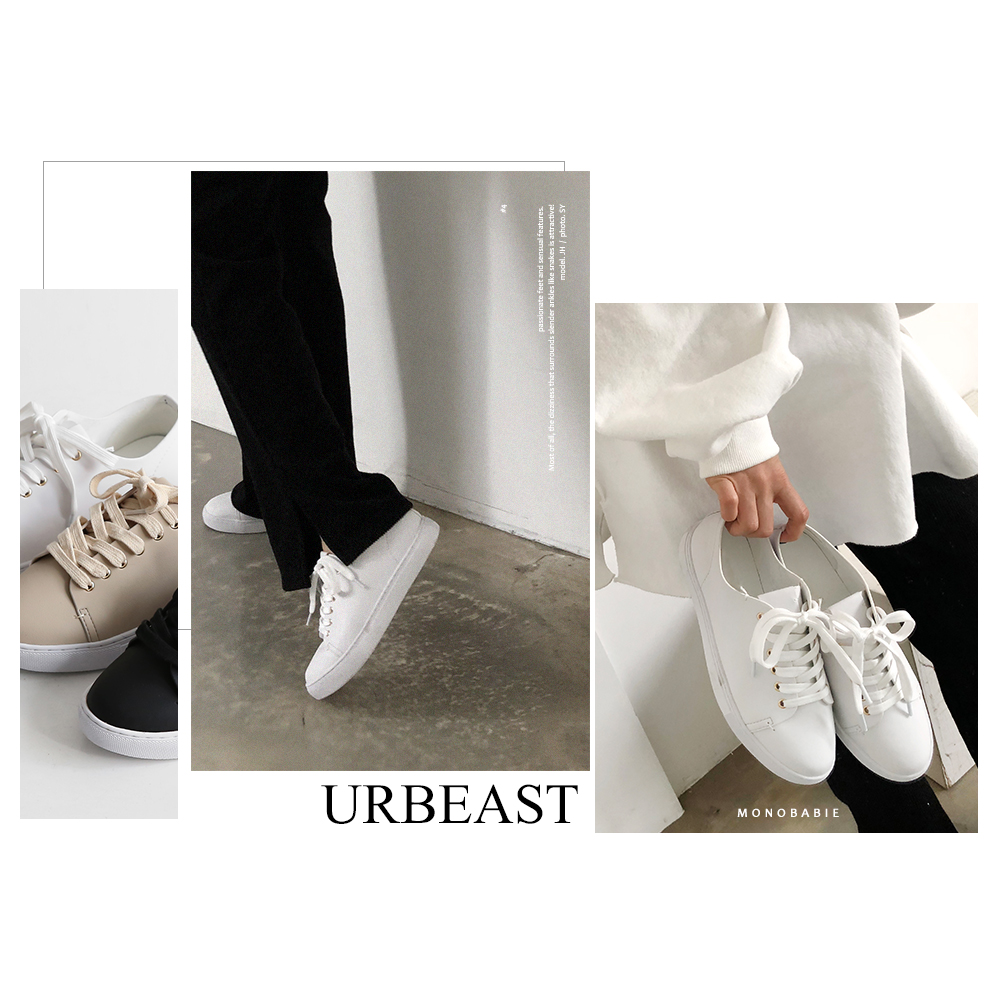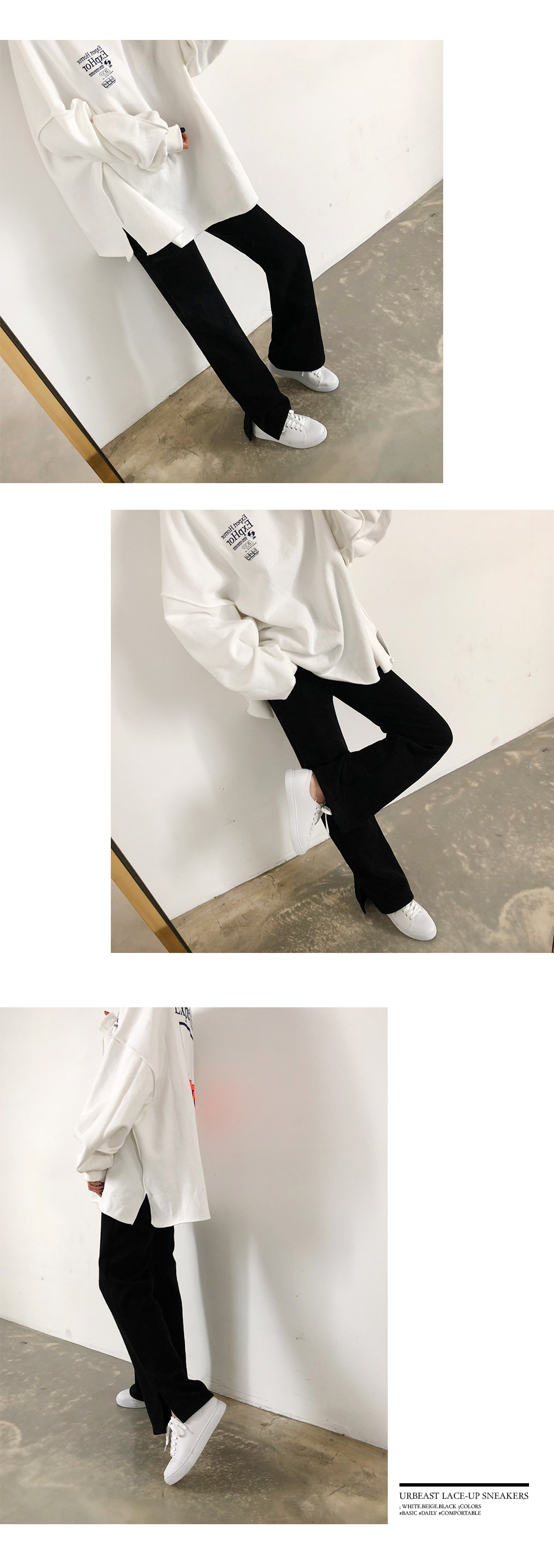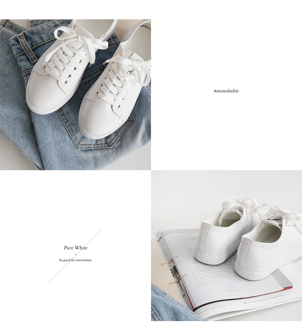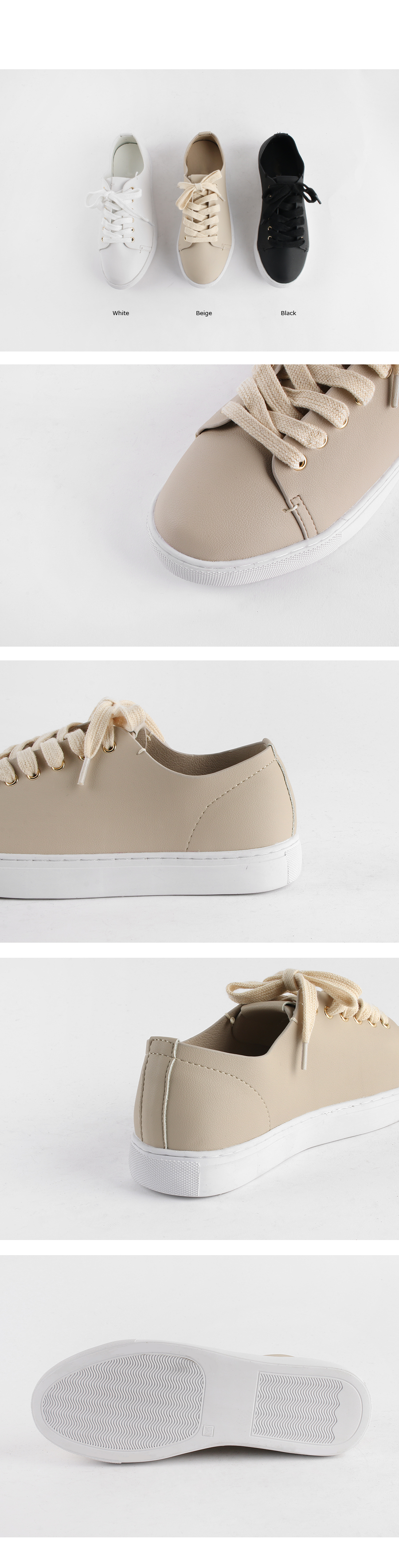 DETAILS - 소재 : 인조소가죽 - 컬러 : white,beige,black - 피팅감 : 정사이즈 / 무게 : 보통인편 - 착화감 : 편해서 데일리 슈즈로 좋아요 - 모델피팅 : 230