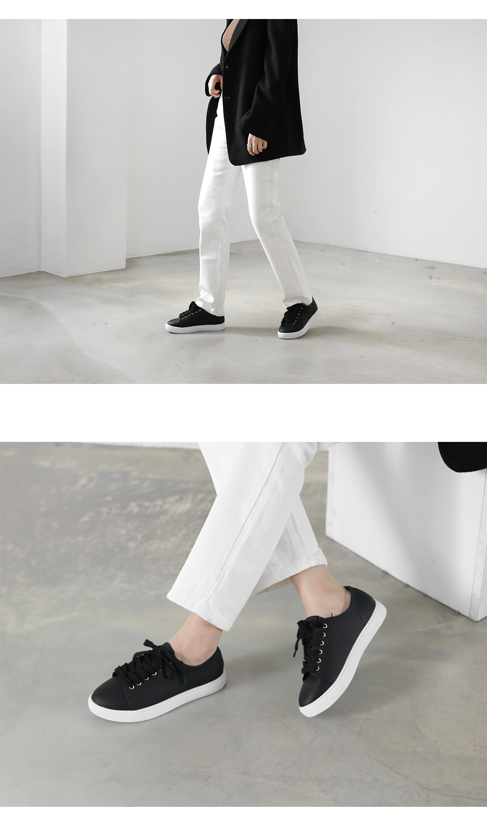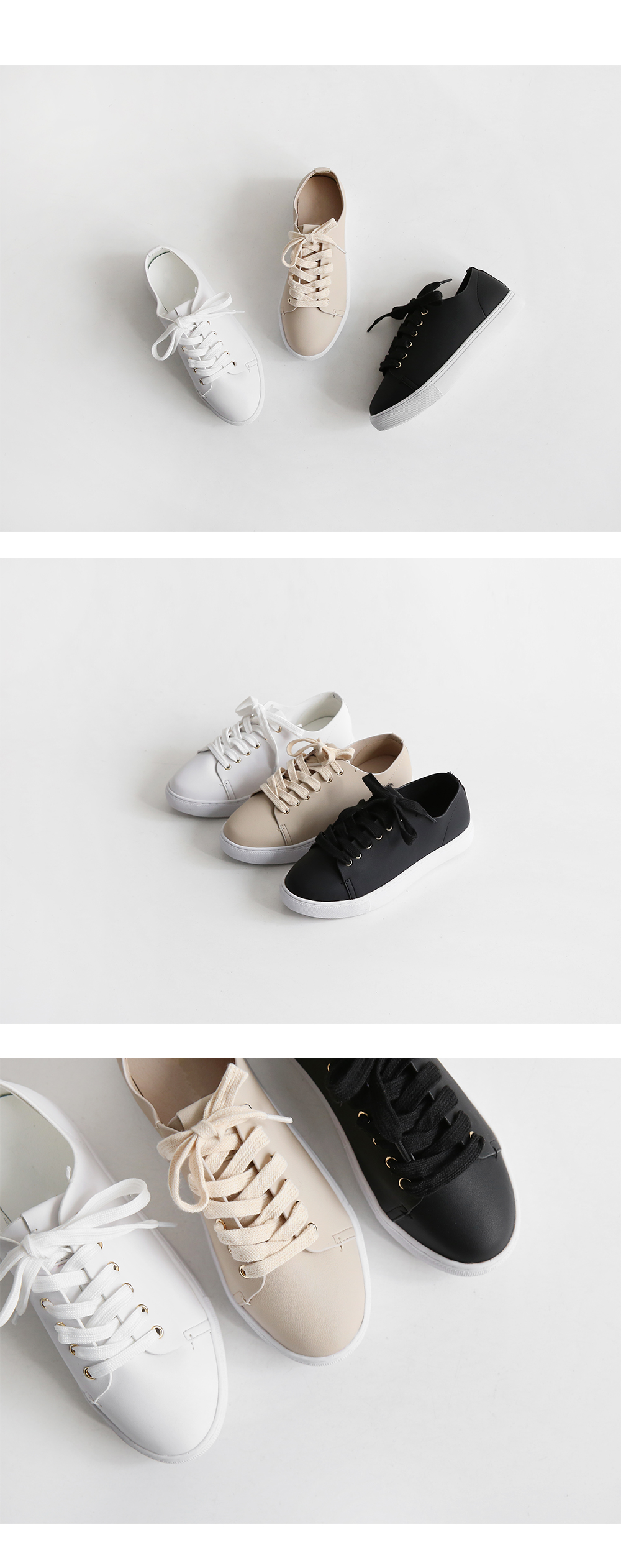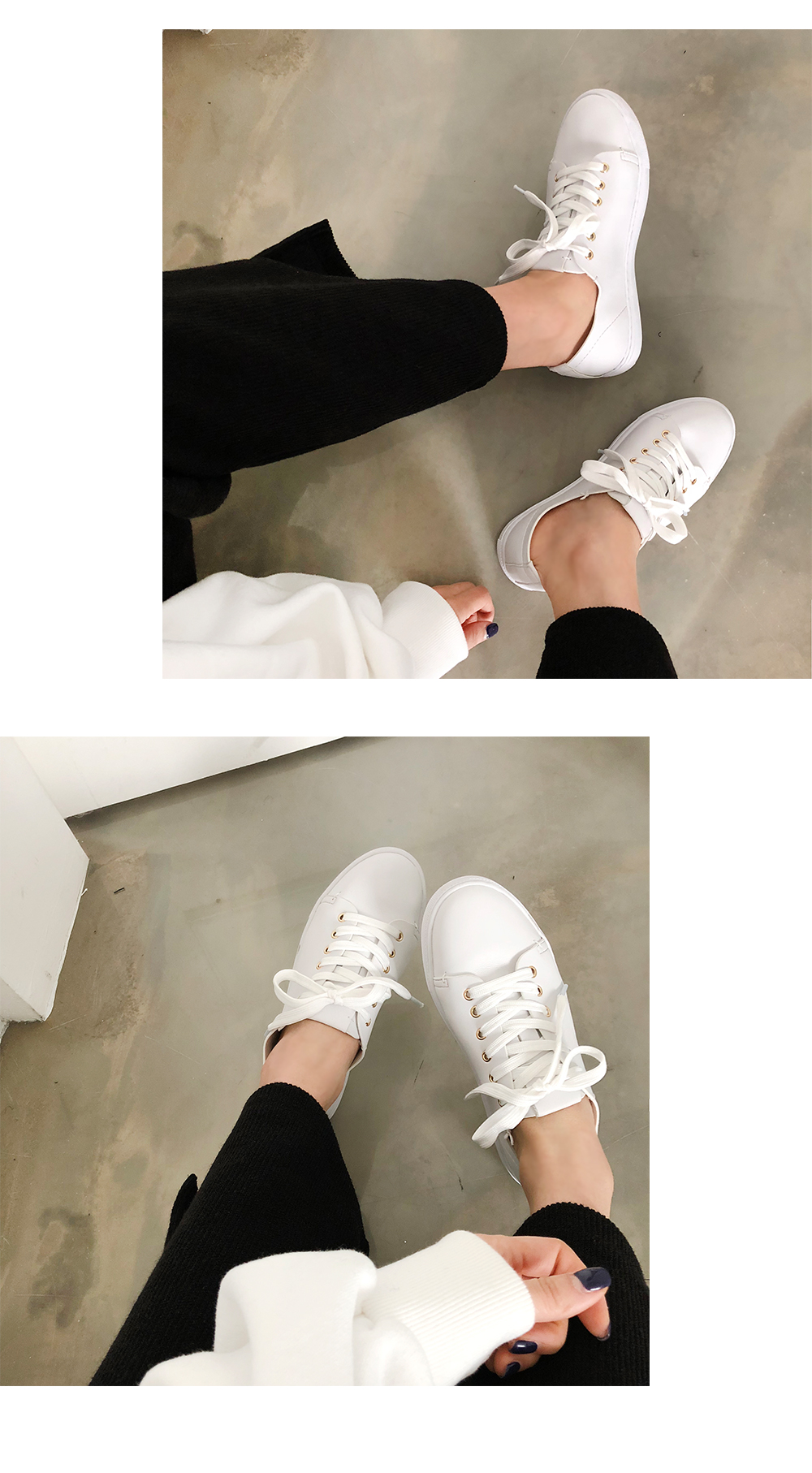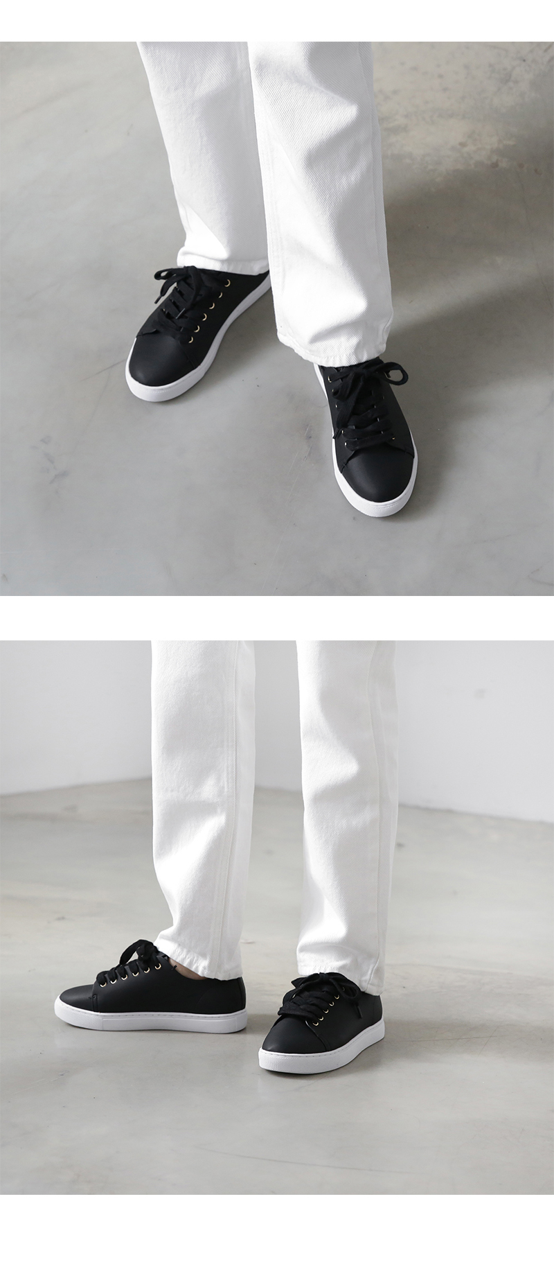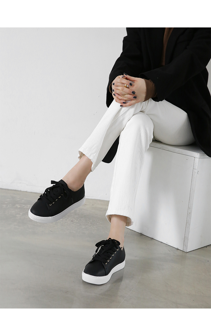 DETAILS - 소재 : 인조소가죽 - 컬러 : white,beige,black - 피팅감 : 정사이즈 / 무게 : 보통인편 - 착화감 : 편해서 데일리 슈즈로 좋아요 - 모델피팅 : 230