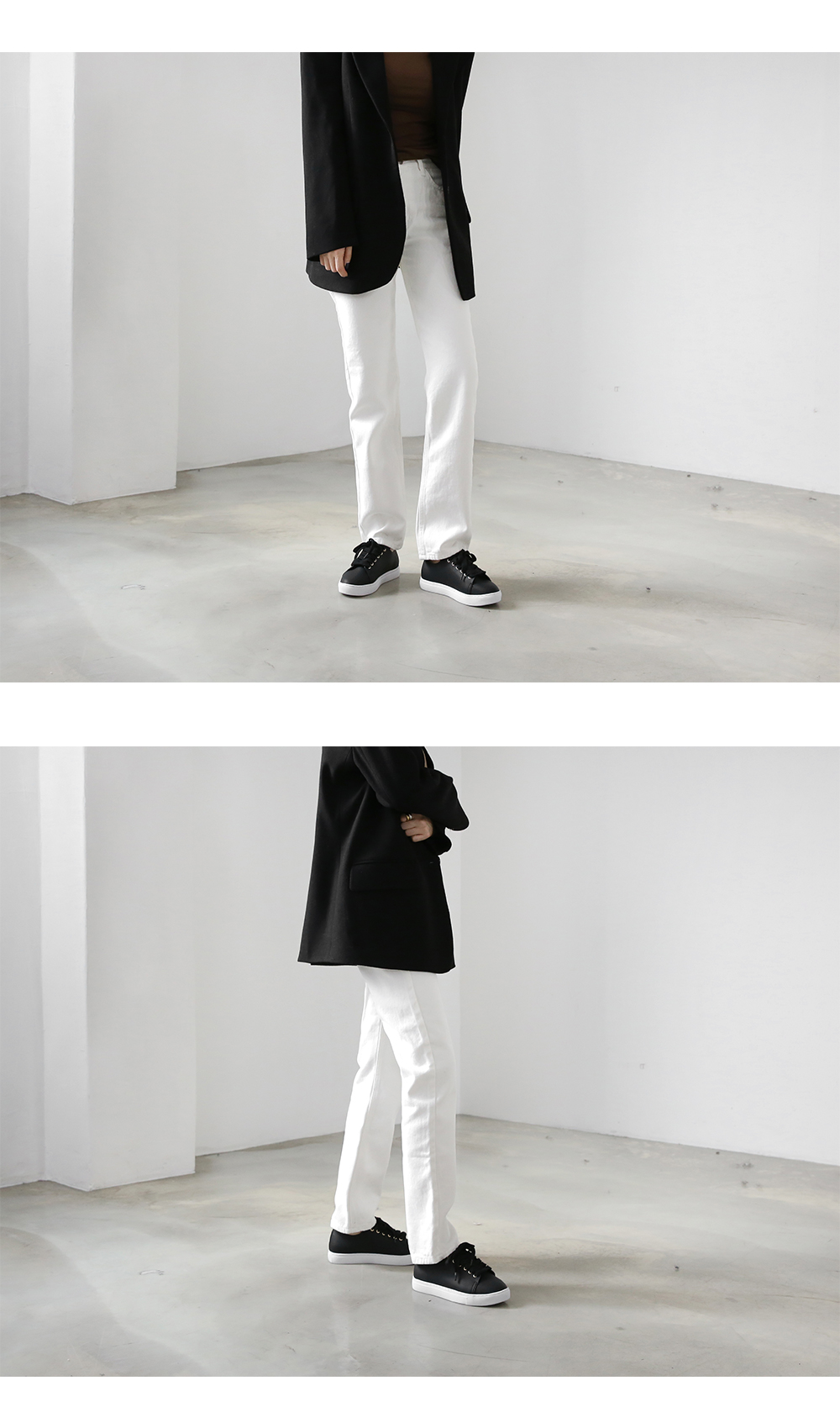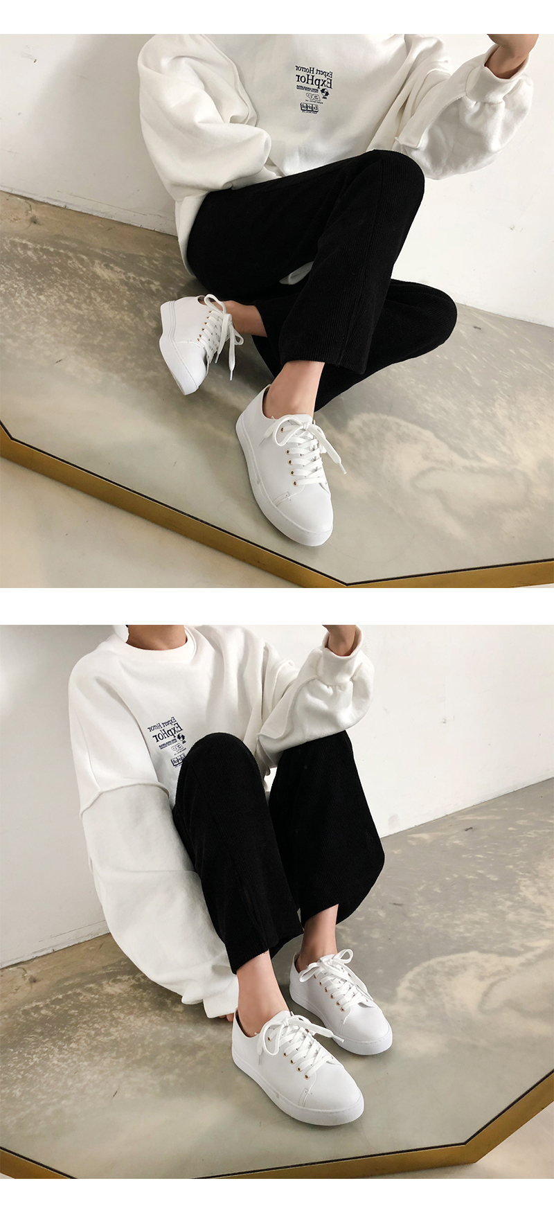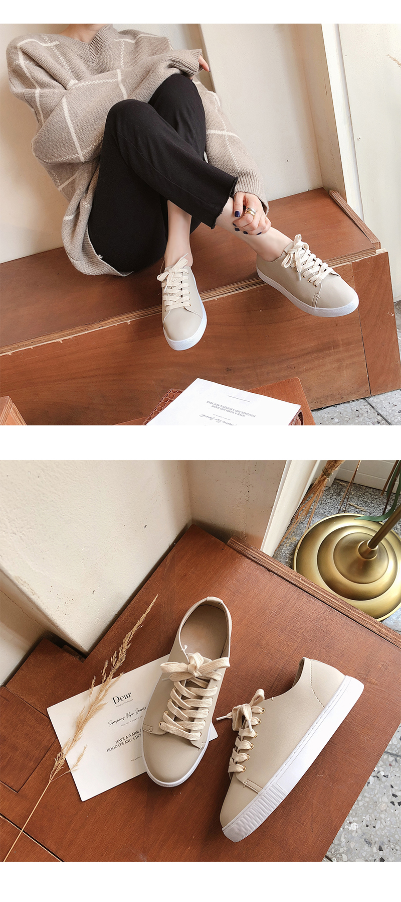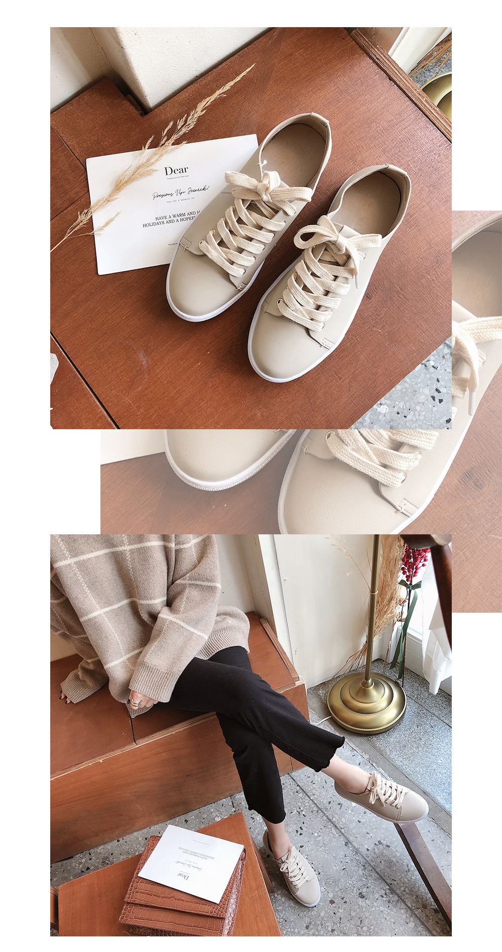 DETAILS - 소재 : 인조소가죽 - 컬러 : white,beige,black - 피팅감 : 정사이즈 / 무게 : 보통인편 - 착화감 : 편해서 데일리 슈즈로 좋아요 - 모델피팅 : 230