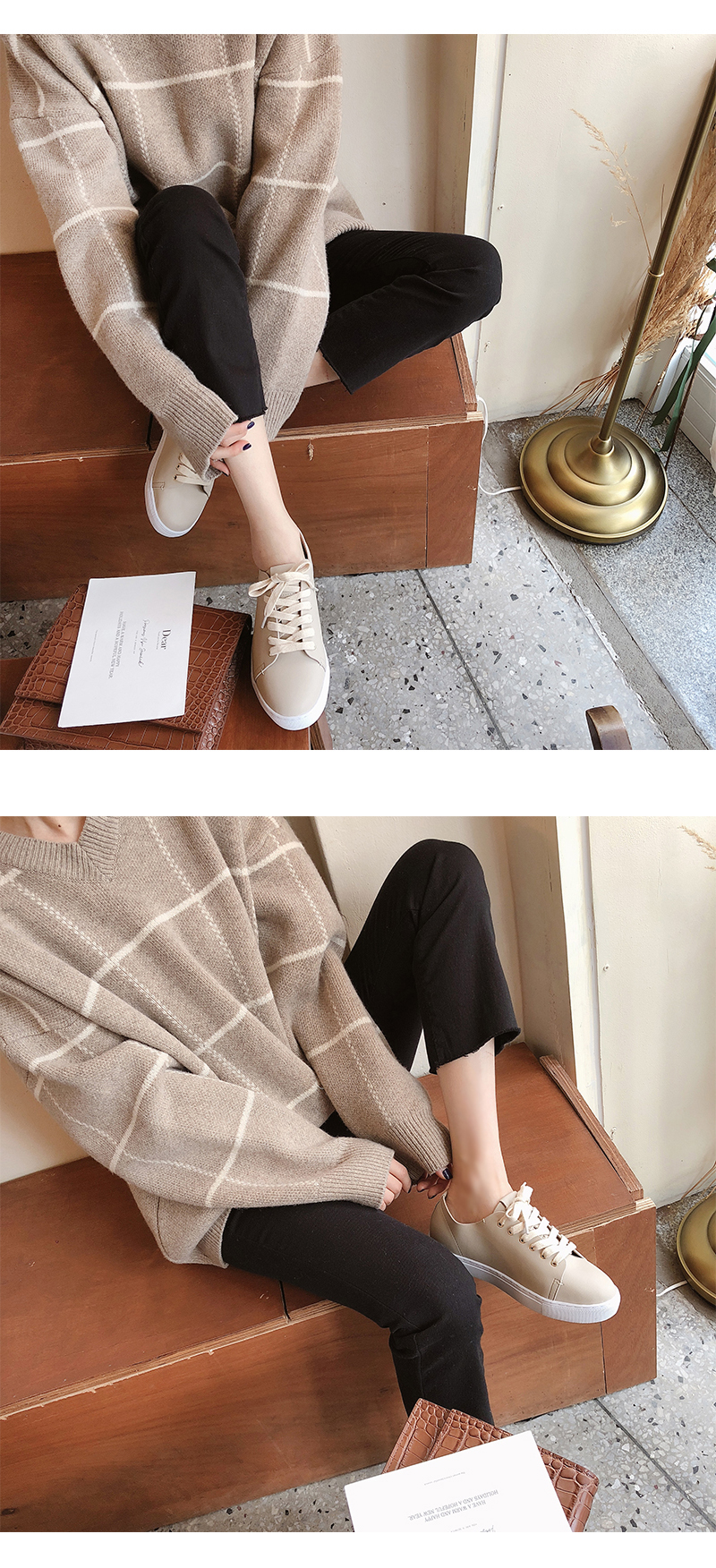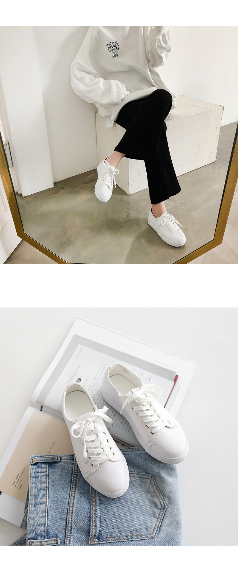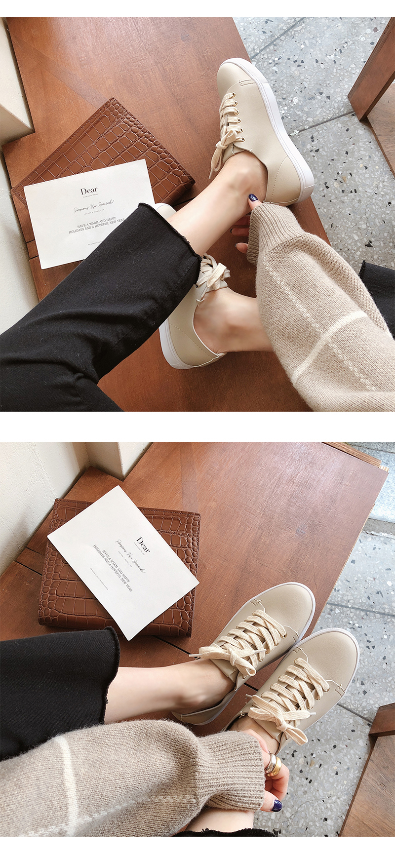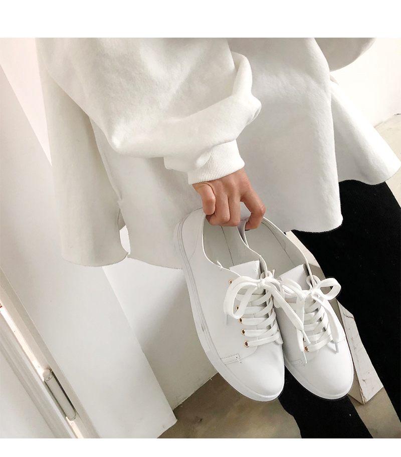 DETAILS - 소재 : 인조소가죽 - 컬러 : white,beige,black - 피팅감 : 정사이즈 / 무게 : 보통인편 - 착화감 : 편해서 데일리 슈즈로 좋아요 - 모델피팅 : 230
