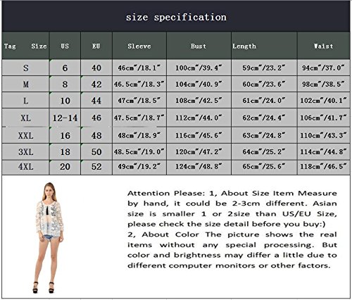 Binding : Apparel Product Description Warm Notice: 1, About Size Item Measure by hand, it could be 2-3cm different. Asian size is smaller 1 or 2size than US/EU Size, please check the size detail before you buy:) 2, About Color The picture shows the real items without any special processing. But color and brightness may differ a little due to different computer monitors or other factors. Different style has different size, please check size chart in the last image; If you can not choose the size, please select one size larger than usual; Hand washing recommend, and washing in cold water; Size: S: Length 59cm"/23.2" Bust 100cm"/39.4" Waist: 94cm"/37.0" M: Length 60cm"/23.6" Bust 104cm"/40.9" Waist: 98cm"/38.5" L: Length 61cm"/24.0" Bust 108cm"/42.5" Waist: 102cm"/40.1" XL:Length 62cm"/24.4" Bust 112cm"/44.0" Waist: 106cm"/41.7" XXL:Length 63cm"/24.8" Bust 116cm"/45.6" Waist: 110cm"/43.3" XXXL:Length 64cm"/25.2" Bust 120cm"/47.2" Waist: 114cm"/44.8" XXXXL:Length 65cm"/25.6" Bust 124cm"/48.8" Waist: 118cm"/46.5" Gender:Women Brand Name:OMONSIM Fabric Type:Lace Neckline:O-Neck Sleeve Length:Long Sleeve Style:Bohemian Material:Cotton Model Number:2016188 Season:Summer Color Style:Natural Color This product is machine washible,but preferred hand washing when you have time and energy and a good Mood.You will be satisfied with the short design, since it can highlight your slender legs.Cover up shrug for Fall Spring.Full see through lace 0 |