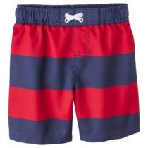 -. Binding : Misc. -. Brand : Goldbug Inc -. Color : Navy Blue/Red -. Department : baby-boys -. Feature : Shorts have a faux drawstring for decoration. / Fabric is UPF 50+ for excellent UV protection. / Elastic waist makes shorts easy to put on and take off, making diaper changes quick and easy. -. PackageQuantity : 1 -. ProductGroup : Apparel -. ProductTypeName : SWIMWEAR -. Title : Baby Infant Boys' Striped Red Board Shorts Swim Trunks