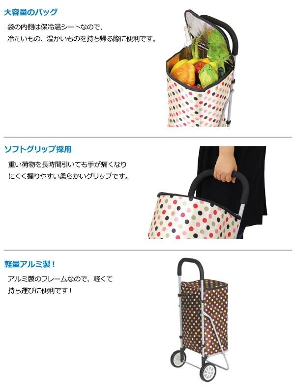 たくさんの荷物を収納できるバッグは、内側が保冷温シートになっているので、冷たいものや温かいものを持ち帰る際に便利です。握りやすく柔らかなソフトグリップと、軽量のアルミ製フレームで長時間荷物を引いていても疲れにくいです。 |