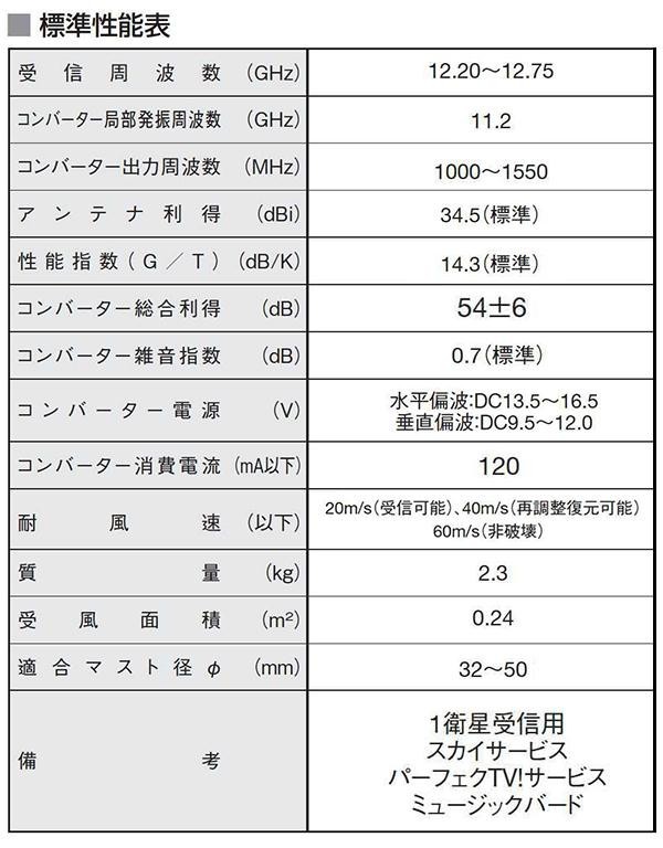 CSアンテナ(1出力型電圧切換方式)です。JCSAT-4A号・JCSAT-3A号(スカパー!プレミアムサービス)から送られる電波を受信する場合に使用します。スカパー!チューナーからの電圧(垂直偏波:DC11V、水平偏波:DC15V)により、CSコンバーターの偏波を自動的に切替えます。仰角、方位角の調整が短時間に行える独自の無段階調整機構を採用しています。 |