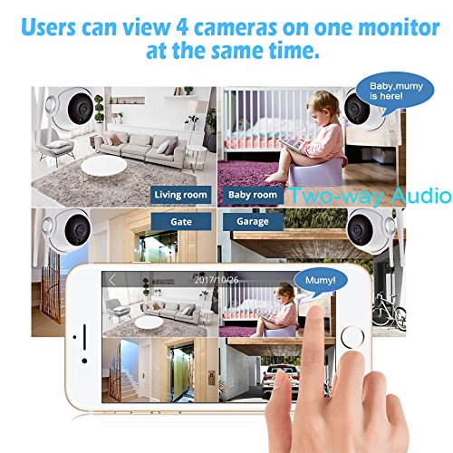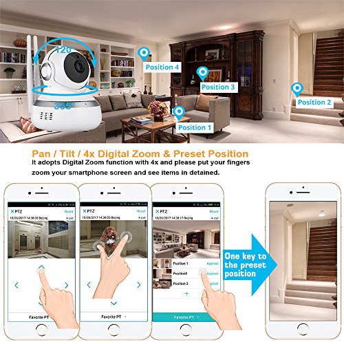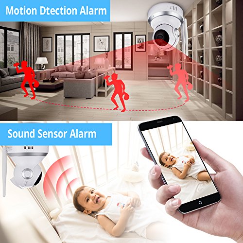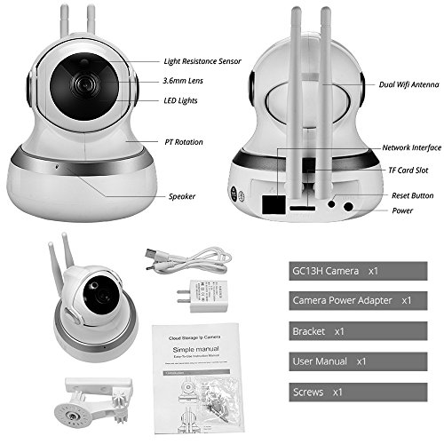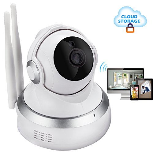 -. Feature : Supports Cloud Storage to avoid the risk of losing footage from an SD card, ensure all your videos are safe, secure and protected. Supports up to 64GB micro SD cards. / Sound Detection and Motion Detection uses state-of-the-art technology to send alerts to your phone, send alarm images to the designated mailbox and camera itself's voice alert. / Support infrared night vision - IRCUT double filter, automatic switch between day and night, 4 pieces IR LEDs around the lens, a night visual range up to 49 feet, make monitoring night like day. / Captures 720P high-definition images, 355° horizontal & 120° vertical rotation range and create a complete 360° coverage smart home system. Remotely control camera pan tilt zoom to view any angle you want. / Easy to set-up: Seamlessly HD video streaming and two-way audio via your smartphone. Support 5 user online, can share up to 10 users simultaneously.