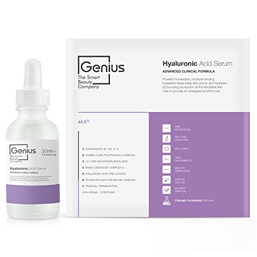 PURE HYALURONIC ACID: GENIUS Hyaluronic Acid Serum contains a potent combination of plant extracts and pure hyaluronic acid and hyaluronic acid pre-cursor which can help reduce the appearance of wrinkles, discoloration and can assist in the reduction of pore size.