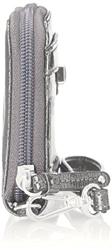 - Feature : Removable strap length: 8" / Five card slots and three slip pockets / High-gloss wallet in zip-around silhouette with metallic logo plaque / Removable wristlet strap