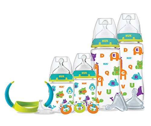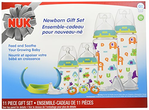 NUK Perfect Fit Newborn Gift Set includes 4 BPA Free bottles: two 5 oz. bottles with slow flow nipples and two 10 oz. bottles with medium flow nipples