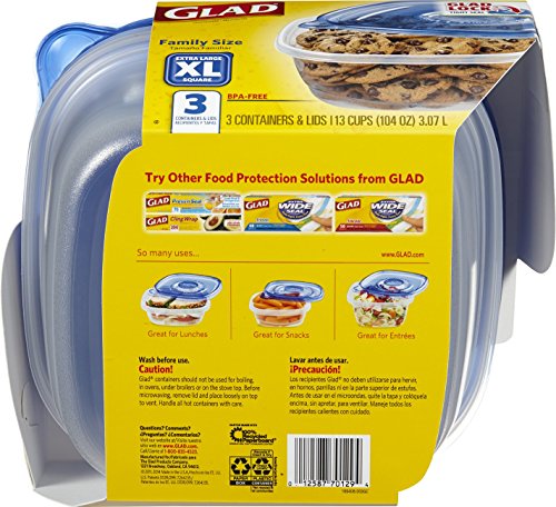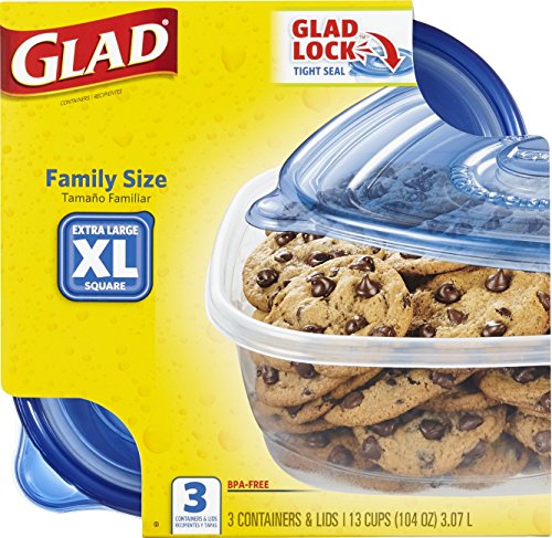 GLAD FOOD STORAGE CONTAINERS WITH LIDS: Glad Family Size Containers hold an impressive 13 cups and are complete with lids to lock-in freshness and prevent leaks