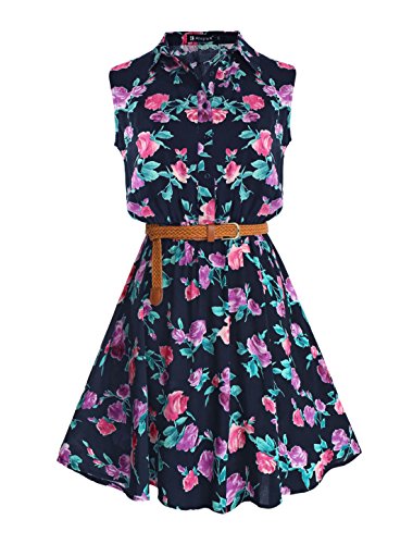 Title : Allegra K Women Floral Prints Sleeveless Belted Shirt Dress L Navy Blue