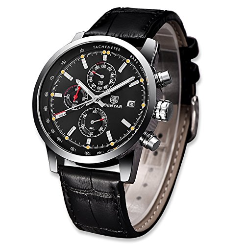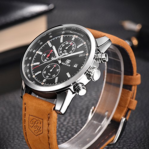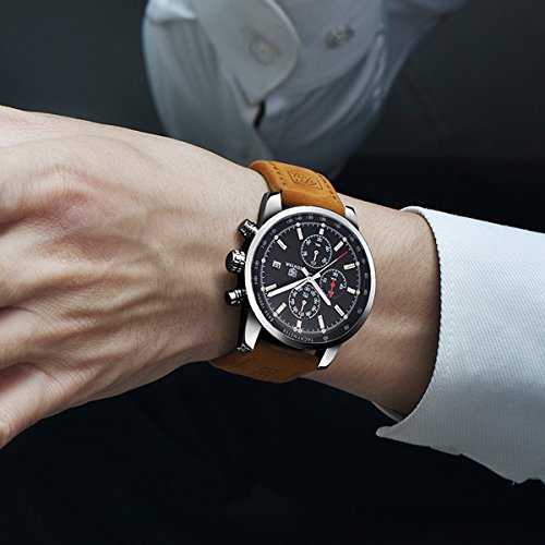 This fashion business casual watch is designed for men. It's a luxury, beautiful, multifunctional, high quality watch, which is great for daily uses.The style is suitable for any occasion. Its classic black dial, durable stainless steel case and leather band give it a very soft and elegant appearance, making it perfects for both business and casual activities.