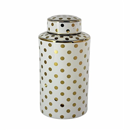 Benzara Decorative Ceramic Covered Jar with Golden Polka Dot Design, White & Gold