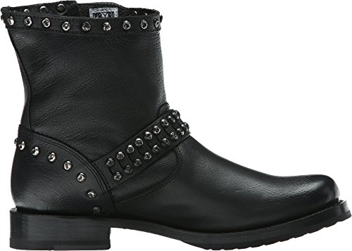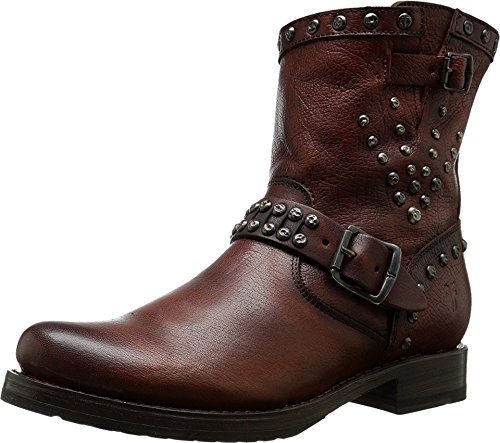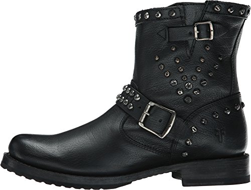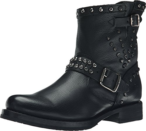 Studded motorcycle boot featuring dual buckle straps at vamp and opening