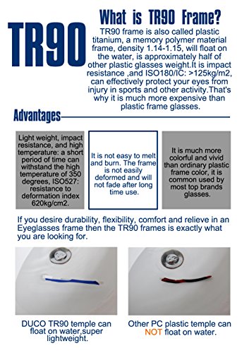 TR90 frame is also called plastic titanium, a memory polymer material frames, density 1.14-1.15, on the salt water will float approximately less than other plastic glasses frame light weight plate frame half of, ISO180/IC: >125kg/m2 elastic, in order to effectively prevent movement due to impact on the eye injury.