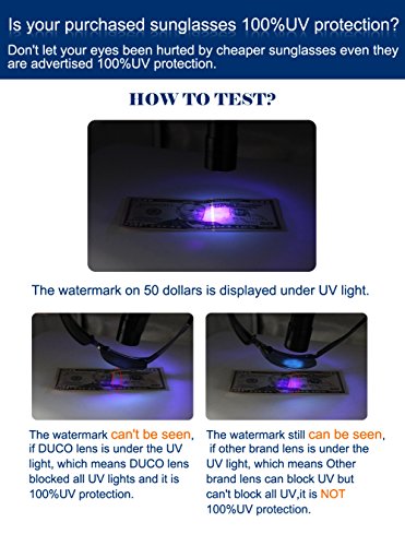 TAC POLARIZED LENS- Real 100% UV400 protection coating, blocks 100% harmful UVA & UVB Rays. It can eliminate reflected light glare and scattered light and protect eyes perfectly. DUCO TAC lens includes 8 layers,1 more layers than normal TAC lens. The 1st and 8th layers are shatterproof layers.The 2nd,3rd and 4th layers are UVA,UVB&UVC absorb layers.The 5th,6th are Polarized layers.The 7th is adhesive layer.The revo color will have one more layer on front lens.