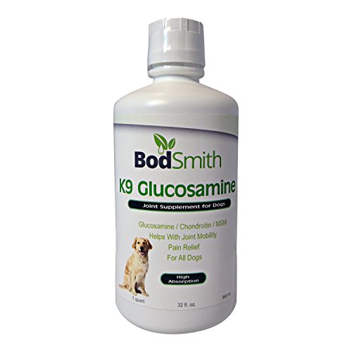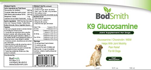 UNCONDITIONAL 100% LOVE IT OR GET ALL YOUR MONEY BACK GUARANTEE! BodSmith K9 glucosamine for dogs has the PUREST and HIGHEST amounts of Glucosamine, Chondroitin and Ultra Pure MSM, which are PROVEN to increase overall health and to help rebuild cartilage and joint tissue. We're so confident in our product we'll let you try it ABSOLUTELY RISK FREE! Use the entire bottle and if you're not absolutely thrilled, you get all your money back. NO QUESTIONS ASKED! If you're serious about your dog's health, click the Add to Cart Button Now! You're covered by our UNCONDITIONAL 100% LOVE IT OR GET ALL YOUR MONEY BACK GUARANTEE! Glucosamine for Dogs is a liquid supplement designed to help dogs with arthritis and joint pain due to age. Most dogs will develop joint mobility issues of some kind during their lives. Glucosamine for Dogs can also be used for younger dogs as a preventative to future joint problems. Glucosamine and Chondroitin are an easily absorbed natural substance that may stimulate the production of proteoglycans, which help maintain the health and resiliency of joints and connective tissues. Supplements in a liquid form are shown to absorb more quickly & efficiently than tablets, offering faster results. As a natural dog food supplement, glucosamine can soothe the symptoms of arthritis and hip dysplasia in dogs. Glucosamine supplements work to restore and regenerate your dog's damaged joints. They also have anti-inflammatory properties. Glucosamine for dogs can be used as a preventative measure in elderly dogs who are at high risk for arthritis. Glucosamine supplements for dogs can help treat the symptoms of dogs already suffering from arthritis. Within two weeks to thirty days, you should notice that your dog has become more lively and active. Some owners report a full recovery from symptoms of arthritis and hip dysplasia.Feature