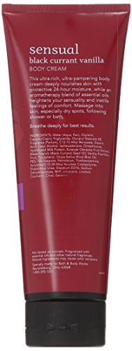 Bath & Body Works Aromatherapy Sensual Black Currant Vanilla Body Cream 8 Oz. : Ultra-rich, ultra-pampering body cream deeply nourishes skin with protective 24-hour moisture, while an aromatherapy blend of essential oils soothes body, mind & mood. Breathe deeply for best results. * Heightens Sensuality * Not tested on animalsFeature