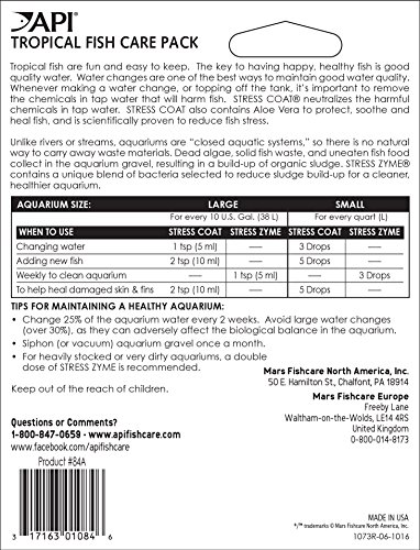 -. Binding : Misc. -. Brand : API -. EAN : 0317163010846 -. Feature : Contains one (1) API TROPICAL FISH CARE PACK Water Conditioner 1-Ounce Bottle 2-Pack / Makes tap water safe for fish and reduces fish stress with soothing Aloe Vera. / Helps keep tropical fish aquariums clean by consuming sludge in the gravel bed, and adds beneficial bacteria. / Includes API STRESS COAT and API STRESS ZYME for optimal tropical fish health. / Use when starting a new tropical fish aquarium. -. IsAutographed : 0 -. IsMemorabilia : 0 -. Label : Aquarium Pharmaceuticals -. Manufacturer : Aquarium Pharmaceuticals -. Model : 84A -. MPN : 84A -. NumberOfItems : 1 -. PackageQuantity : 1 -. PartNumber : 84A -. ProductGroup : Pet Products -. ProductTypeName : PET_SUPPLIES -. Publisher : Aquarium Pharmaceuticals -. Studio : Aquarium Pharmaceuticals -. Title : API TROPICAL FISH CARE PACK Water Conditioner 1-Ounce Bottle 2-Pack -. UPC : 317163010846
