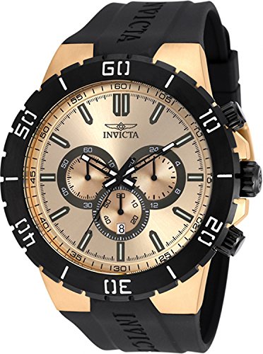 A flexible polyurethane strap and chronograph feature dial give this Pro Diver from Invicta a sporty and comfortable feel that will fit any man's tastes. The polished 18-karat gold plated stainless steel case with black ion plated bezel makes for a stylish timepiece that will complete any man's collection.