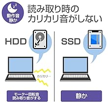 動作音が静か 通常のハードディスクのような駆動部分がない為、モーター回転音や読み取り音(カリカリ音)がなくディスク自体はほぼ無音に近くなる。 ※CPUやファン等搭載パーツにより変化します。 |
