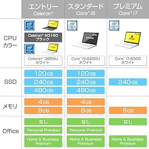 3タイプのノートでさらに搭載パーツをカスタマイズ MB-BNシリーズは3タイプのグレードからさらにSSD/メモリ/Microsoft Officeがカスタマイズ可能。 ご予算、ご使用用途にあった製品を選ぶことが出来る。 ■エントリー(ブラック:N3160/ホワイト:Celeron 3855U) インターネット閲覧やSNS投稿など普段使いにちょうどいい。色はブラックとホワイトの2色ご用意。 ■スタンダード(Core i5-6200U) オフィス作業はもちろん、写真や動画など趣味にも最適。コストパフォーマンスに優れたオールラウンドモデル。 ■プレミアム(Core i7-6500U) Core i7-6500U搭載で複数作業を行っていてもパフォーマンスは落とさず高い処理性能でストレスフリー。 ハイパフォーマンスなプレミアムモデル。 |