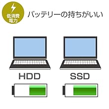 消費電力が少ない 動作音が静かなのと同様にヘッドなどのモーター駆動部分がないため、ハードディスクより消費電力が少なく、発熱も、バッテリーの減りも低く抑える。 |