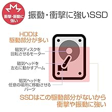 振動・衝撃に強い ハードディスクと比べ、ヘッドやディスクが存在しないため、衝撃や振動による耐性が強く、ハードディスク特有の駆動部分の故障の心配がない。 |