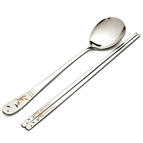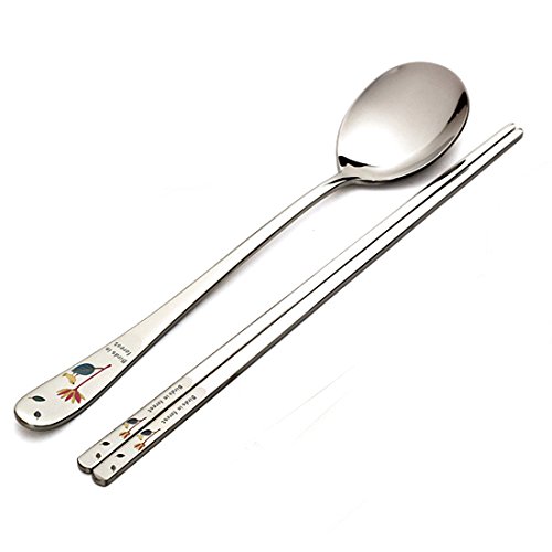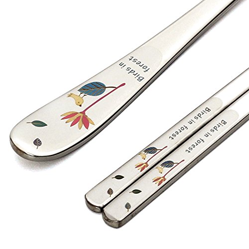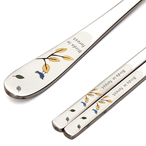 Stainless Steel 2 Sets Korean Style Metal Chopsticks Spoon Set, Blue Birds