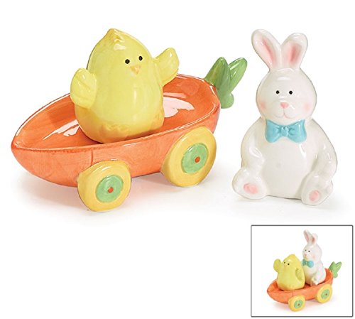 - Bunny and chick salt and pepper shakers that sit in a carrot cart dish.