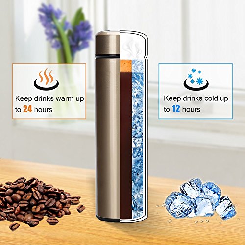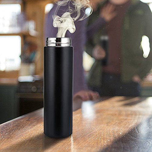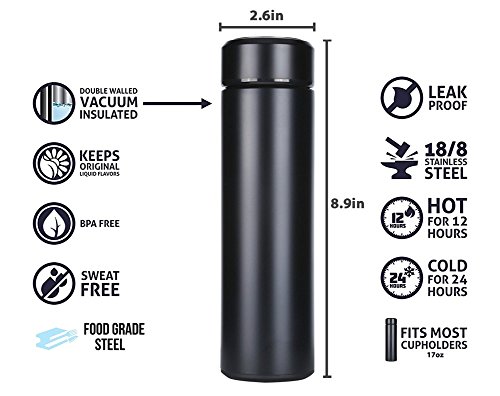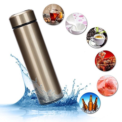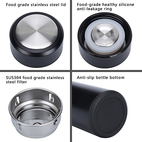 -. Feature : High Quality: This sports water bottle is made from high-quality 304 stainless steel. It is crafted and designed with a powder coated finish to last and should not rust. It's better than using a plastic or glass kettle! / Insulationg Properties:The double vacuum insulated wall reduce air heat transfer and keep water hot for up to 24 hours and cold for 12 hours. Durable stainless steel interior and exterior withstand the demands of everyday use. / Intimate Design: The natural rubber cup bottom, anti-skid and wear-resistant. Tea leaf filter makes drinking and washing more convenient. Food-grade pp material of the lid avoid leakage so you rest assured when drinking. / Clean Up :Cup mouth with polishing technology, you are ability to effortlessly refill and clean the bottle. Take apart the lid and do not spend more than 30 seconds cleaning your cup. No brush needed! / Easy To Carry:17 ounce (500 ml) enough capacity is perfect for people at office, school,family, park, hiking, camping, indoor and outdoor activity. And also very portable for an ongoing.
